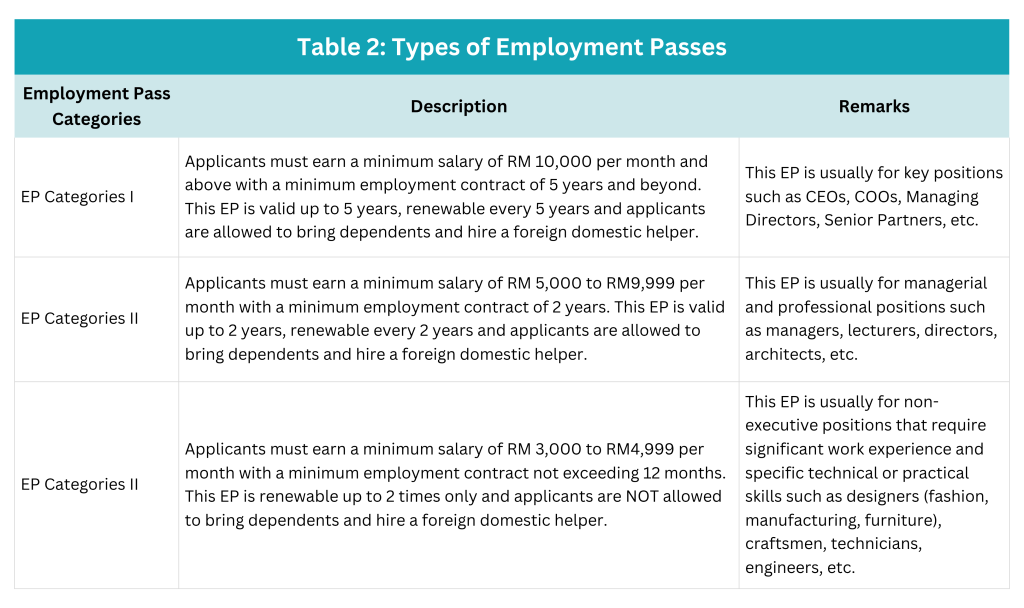 Family members may also apply for a Dependent Pass to stay in Malaysia with the Employment Pass holder. However, Dependent Pass holders are generally not allowed to work or earn income in Malaysia unless they obtain separate approval.
